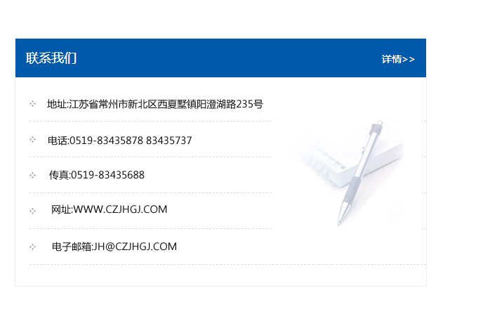 傳真:0519-83435688    郵編:213135    網址:WWW.czjhgj_com.jxhrkkj.com    電子郵箱:JH@czjhgj_com.jxhrkkj.com